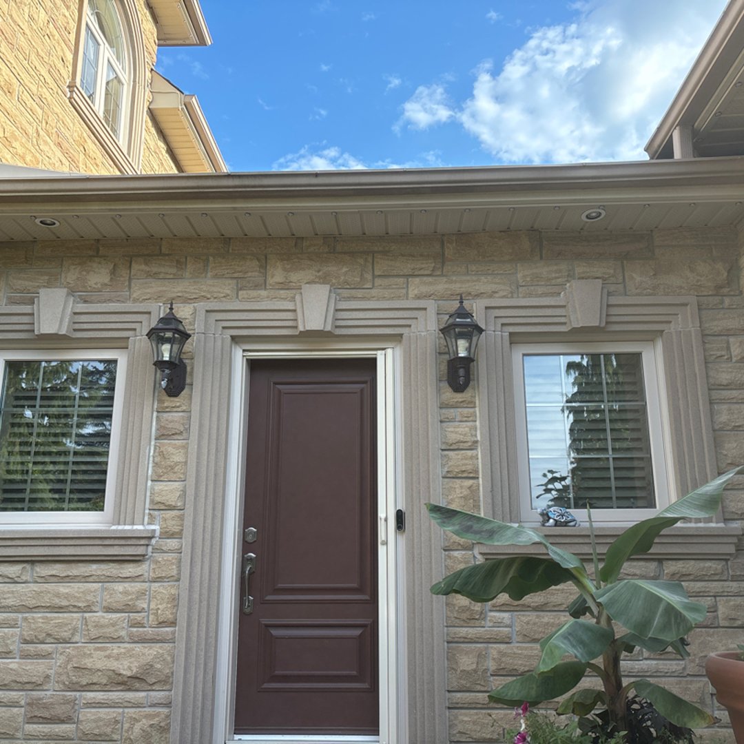 - Brick entrance walls and pillars – Mortared brick at driveway entrances and property lines. Very common in Ontario subdivisions.